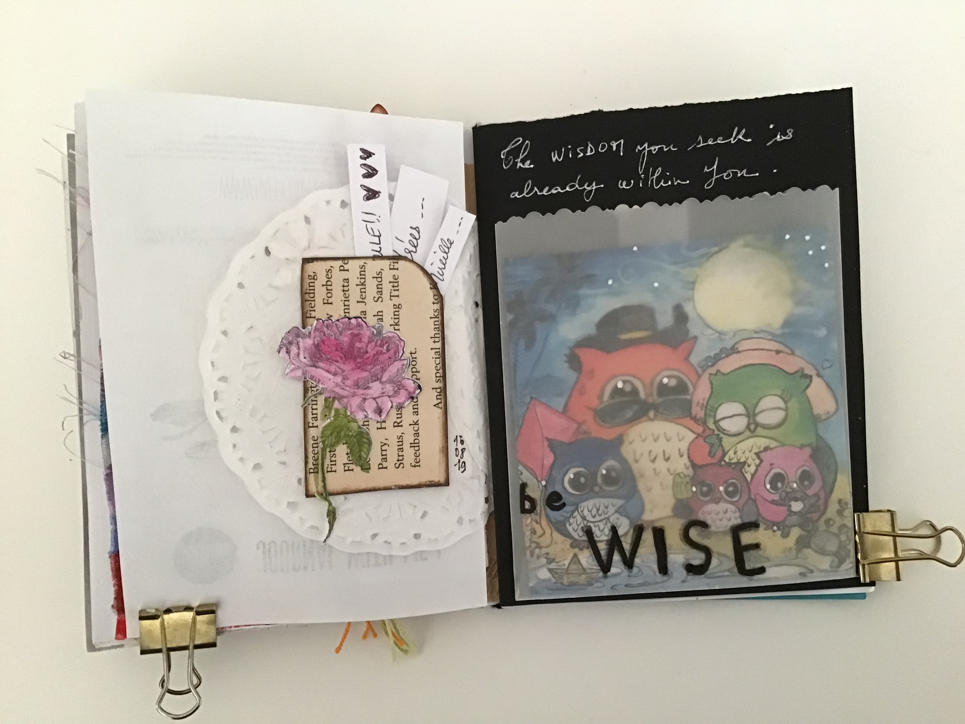 Une double page de mon journal avec le verso du filtre à café et un napperon aujourd’hui. J’utilise mon matériel de scrap …plus ou moins délaissé ces dernières années.